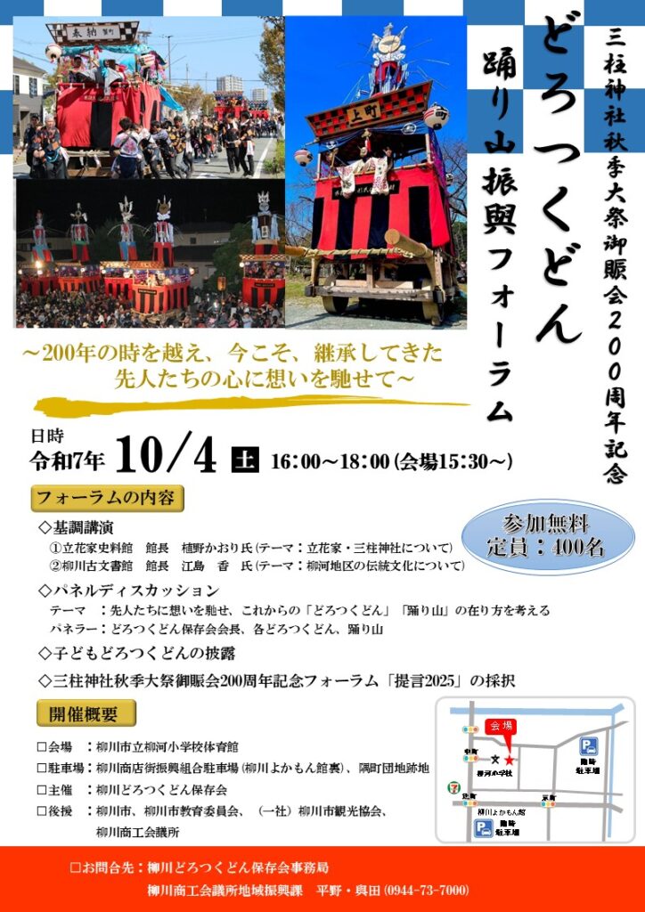初代柳川藩主「立花宗茂」と正室「誾千代」、岳父「戸次道雪」を祀る三柱神社が現在地に建立されて今年で200年を迎えます。その節目を記念して、三柱神社および各種関係団体では、 10月11日(土)から13日(祝・月)の秋季大祭御賑会(おにぎえ)の期間中、福岡県指定無形文化財の「どろつくどん」や「踊り山」などが実演披露する【大競演会】、至高の音楽で新たな柳川の魅力創出を目指す【御賑会JAZZ】などを三柱神社敷地内の高畑公園を中心に実施します。また、10月4日(土)には、「どろつくどん」や「踊り山」の歴史を振り返り、次世代への継承を考える記念フォーラムを柳河小学校体育館で開催されます。